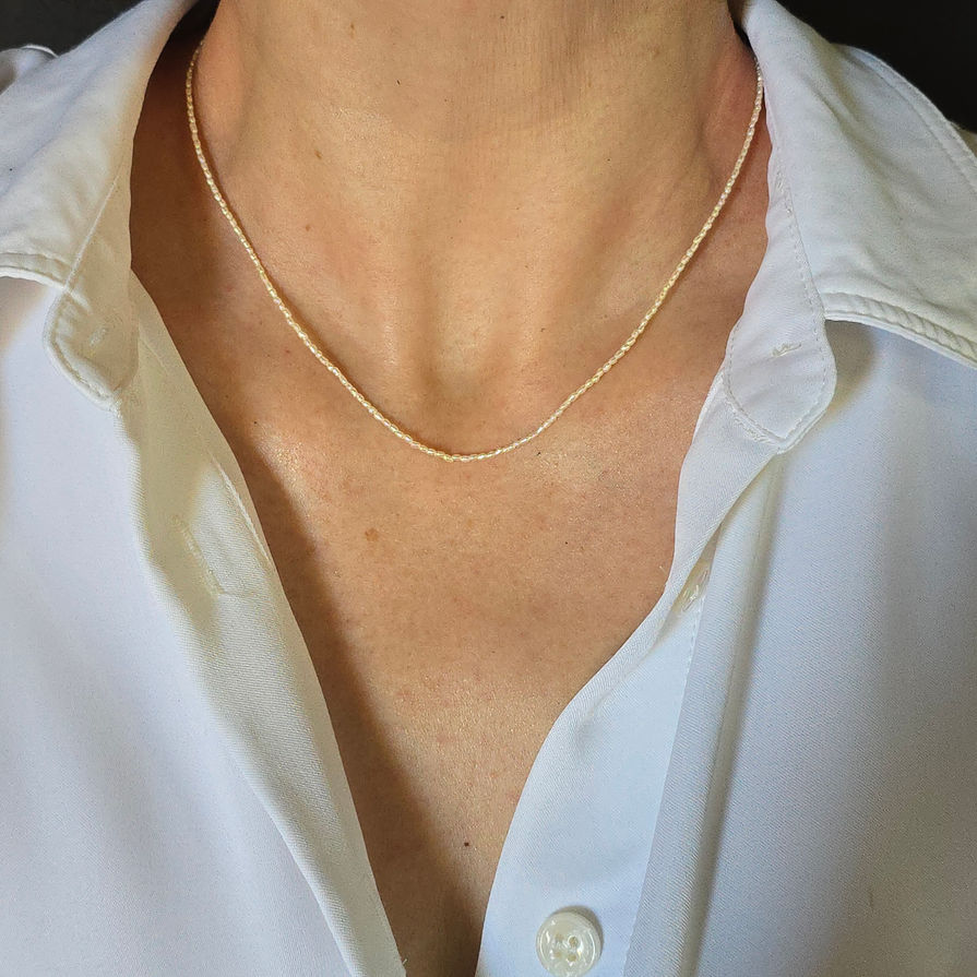 Beaded freshwater pearl necklace with 14k gold filled clasp, plus a 2" extension chain for adjustable length. These tiny pearls make a very versatile, timeless piece that can be worn for any occasion, and for many decades. Look through our extra pendants that you can add to this as well!
