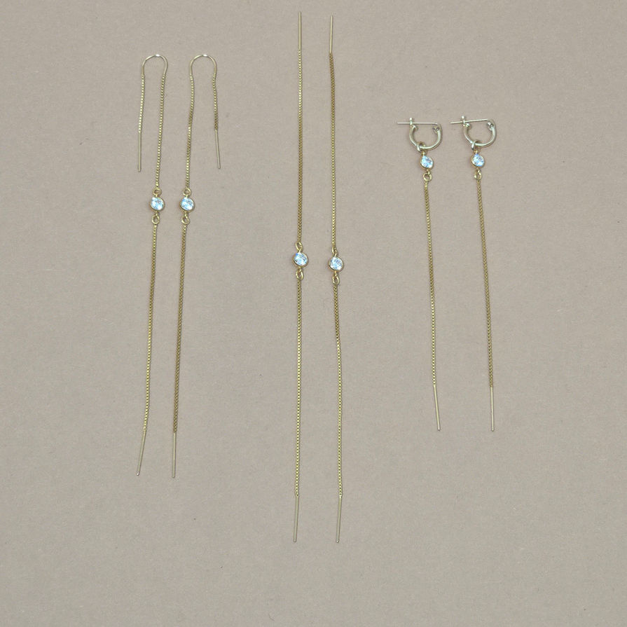 A small shimmery CZ stone and a shimmery box chain pendant hang from tiny hoops. The pendant can be removed so the hoops can be worn every day.