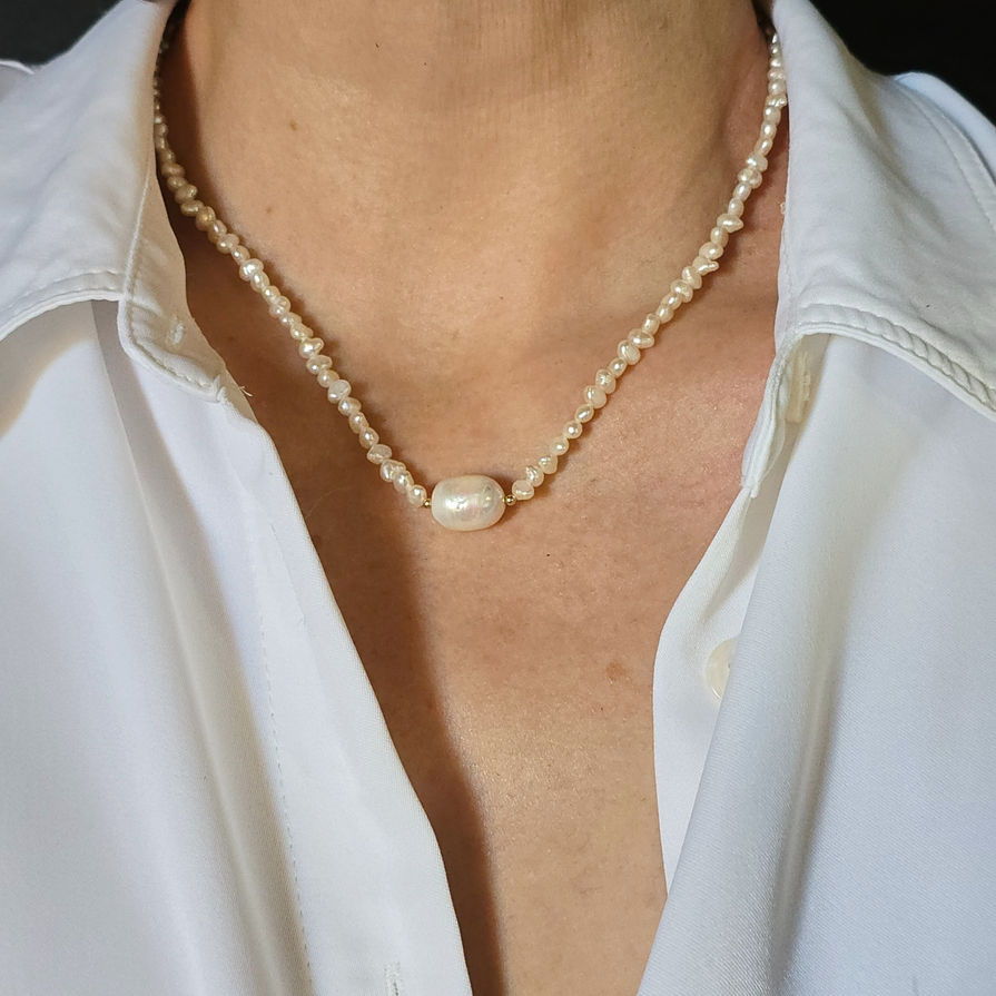 Beaded freshwater pearl necklace with 14k gold filled clasp, plus a 2.75" extension chain for adjustable length. Two 14k gold filled beads sandwich the main, larger pearl at the center.