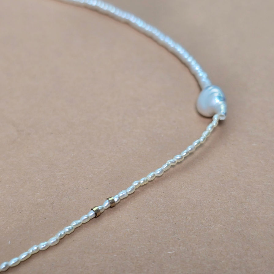 Beaded freshwater pearl necklace with 14k gold filled clasp, plus a 2" extension chain for adjustable length. One side has thicker pearls, while the other half has tiny, slim pearls. Three 14k gold filled beads sprinkled throughout the side with the thin pearls. Larger teardrop shaped pearl in the center. *One of a kind.
