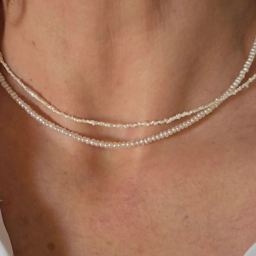 *CUSTOM PREORDER ONLY* Beaded freshwater pearl necklace with 14k gold filled clasp, plus an extension chain for adjustable length. These tiny, thorn-like pearls make a very versatile, timeless piece that can be worn for any occasion, and for many decades. *If you prefer solid gold, or sterling silver, please email your request and we'll get back to you about price / availability.
