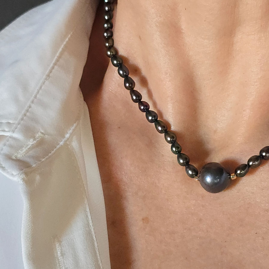 Beaded dark iridescent blue freshwater pearl necklace with 14k gold filled clasp, plus a 2" extension chain for adjustable length. 14k gold filled beads sandwich a large, iridescent dark blue round pearl. Can be worn from 16.5 - 18.5" long. *One of a kind*