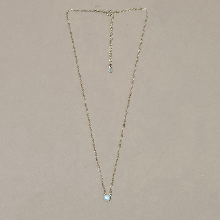 A tiny, dome-shaped pearl hangs on a delicate, shimmery chain with spring clasp. Extra 2" adjustable chain with a mirrored tag dangles down the back. You can order sterling silver or 14k gold fill.